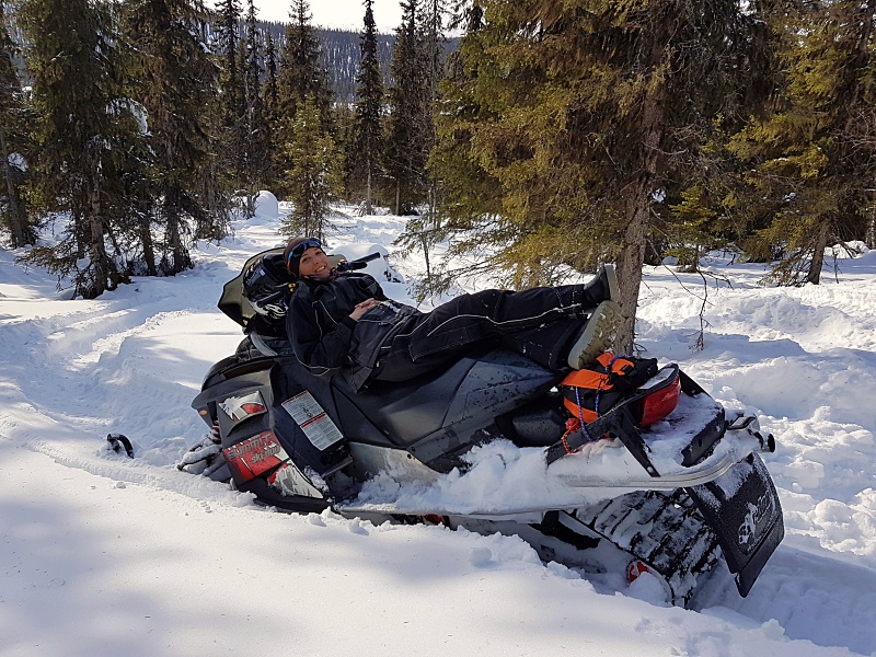 Vi körde ner till myrarna och letade oss tillbaka till myren där vi kunde leka. Det var roligt att öva på körning i lössnö, men mycket av myrarna var lömska områden där öar av hård, vindpackad snö fanns här och där under ytan. Det blev svårt att leka runt i snön när det plötsligt slog och hoppade i maskinen. Vi testade flera myrar med samma besvärliga underlag tills Micke fick syn på ett område som låg lite högre upp än de andra. Vi testade och där fanns ingen hårdpackad snö, bara djup, fluffig snö i massor! Vi snurrade runt på myren och njöt. Själv klarade jag inte mer än ett varv så var jag tvungen att leta efter skoterspår att stanna på och vila. Min skoter gick så tungt i snömängderna att den nästan stannade. Jag pustade någon minut och sedan iväg igen. Så höll vi på ett tag tills jag inte lyckades med min sväng i lössnön och fastnade i massorna med skoternosen stickandes upp ur snön som ett flöte. Micke kom till min undsättning och vi kämpade en stund med att försöka packa snön tillräckligt under skotern. Den här delen av myren tycktes vara bottenlös av snö! Vi stod redan djupt nere i snön utan något tecken på att närma oss marken. Vi tog aldrig reda på hur djupt det egentligen var men upplevde det som nästan oändligt. När vi gjort vad vi kunnat för att packa snö var det dags att göra ett försök att komma lös, och på något mirakulöst sätt lyckades det och jag körde raka spåret till leden för en välbehövlig vila. Det blev fort kallt efter att ha blivit svettig i flera omgångar under dagen, så jag var snabbt tillbaka och gjorde något litet varv till. Men orken var slut och vi hade hela leden kvar att köra tillbaka till bilen, så vi tog oss till en vindskyddad plats för att äta. Jag blev lite frusen när ansträngningsnivån minskat drastiskt, så jag tog på mig en extra tröja och satte mig bredvid Micke på hans skoter. Jag var glad att solen kommit fram en sväng. Vi småpratade lite medan vi åt och plötsligt kom en Lavskrika och landade på min skoter. Allt vårt fokus hamnade på den lilla fågeln och gjorde ett flertal försök att locka den närmare, men vi lyckades bara få den att flytta sig från styret till dragkroken. Det var en riktigt mysig stund i skogen men tillslut var det bara att inse att dagen var slut och vi tvungna att köra mot bilarna.