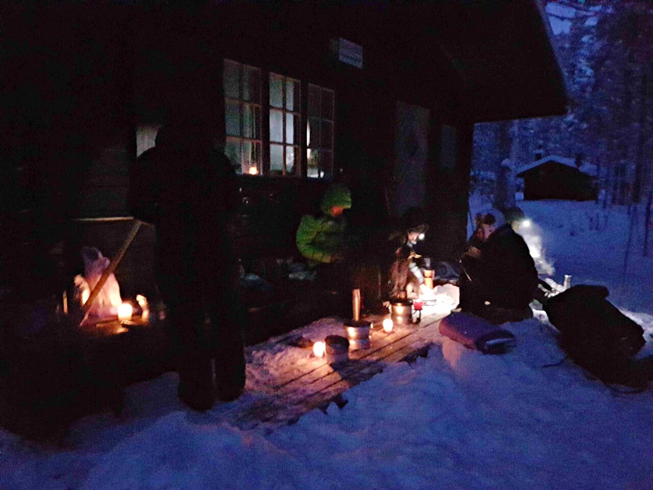 När vi började bli lite för kalla började vi åka tillbaka och två av killarna började tävla i baklängesåkning. Vår gruppledare som var en av dom, fick problem och ramlade omkull baklänges med skidorna spretandes upp i luften, två andra försökte hjälpa honom att räta upp skidorna och komma på fötter. När vi såg gruppledarens ormande för att komma på rätt köl igen brast vi alla ut i ett härligt gapskratt som höjde vårat humör. Med sina vänners hjälp kom han på fötter igen och vi tog oss glada tillbaka till stugan. Vi uppehöll oss i närheten av stugan under dagen och tittade på de vackra snötäckta träden. Under Muddusturen hade vi också i uppdrag att berätta om ett ämne vi valt och den här dagen var det min tur. Jag hade valt att läsa på om solen och dess effekter på jorden och klimatet, vilket för mig varit mycket intressant att läsa på om. Efter den lilla genomgången hade vi en kort klimatdiskussion och mitt intresse av ämnet ökade lite till. Efter mörkrets inbrott såg vi plötsligt något lysa svagt mellan träden. Det höll oss sysselsatta ett tag att fundera på vad det kunde vara. Ljuset tycktes försvinna ibland och sedan komma tillbaka. Några av oss tyckte att det var våra egna rörelser som gjorde att det försvann och andra menade att det var ljuset som rörde sig, och vi spekulerade i om det var månen som reste sig bakom träden. Det visade sig vara vår lärare med sin pannlampa som överraskade oss med att redan tagit sig hela vägen till stugan!