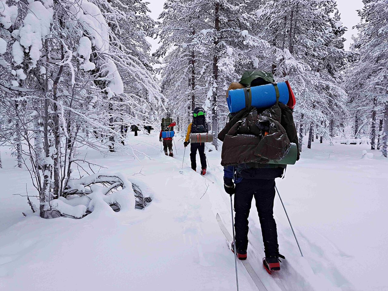 Innan vi skulle bege oss iväg ut på leden igen hade vi ett möte i stugan och det hjälpte mig att nästan hinna få upp värmen i fötterna. Vi tog samma väg tillbaka som vi gjort till stugan och följde samma guppiga led. Först kändes det lite tråkigt att inte se någon ny del av nationalparken, men stor del av leden hade vi passerat i mörker. Det var roligt att se sandåsen i dagsljus och se vart vi faktiskt varit tidigare. Det gick lite bättre, tack och lov, för oss att ta oss upp och nerför kullarna nu efter vila och i dagsljus. Mat åt vi direkt på leden och fortsatte igen så fort vi var klara. När mörkret föll tidigt på eftermiddagen hamnade vi i ett winter wonderland! Snön gnistrade fantastiskt på alla grenar. Kristallerna blinkade till i det svaga pannlampeskenet och jag fantiserade mig bort i det magiska landskapet. Jag försökte suga åt mig den härliga känslan av att passera igenom Kung Bores rike och fascineras av att träden orkade hålla upp det gnistrande vita tjocka täcket. Det var ganska tyst och lite prat när vi skidade fram, bara det knarrande och frasande ljudet av skidorna mot snön och prasslet av kläderna hördes, och jag hoppades att de andra också såg allt det vackra och njöt av omgivningen och inte bara var tysta av trötthet. Tiden hade kunnat stå stilla när vi tog oss fram i sagolandet, men allt har sitt slut och det var dags för oss att stanna för natten. Vi stannade på en fin plats inne bland träden, och jag och min tältkamrat ansträngde oss lite extra för att göra det riktigt mysigt på lägerplatsen den här sista natten. Det blev bra och jag tror faktiskt de andra blev en smula avundsjuka när vi skottat upp en sittbänk i snön och hade levande ljus i både tältet och utanför.