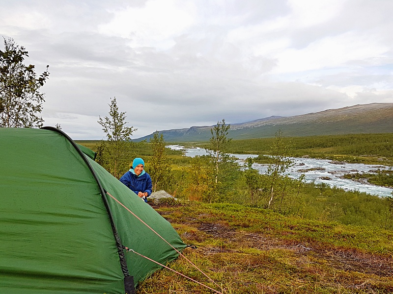 Mycket av dagen hade ju redan gått så det blev en kort vandring runt det fina fjället Akka. Jag tittade upp mot fjället flera gånger och imponerades av den ståtliga jätten. Vi tältade och åt middag vid kanten av en å, och vi njöt av att äntligen vara i fjällen och ha en härlig utsikt. Det var skönt att vara här ute och andas in luften tillsammans med likasinnade och dessutom var vädret var med oss så pass att vi hade uppehåll. Det kändes verkligen bra att känna den mjuka marken under fötterna igen och vara omgiven av de knotiga dvärgbjörkarna. Det är här ute i naturen jag mår som bäst.
