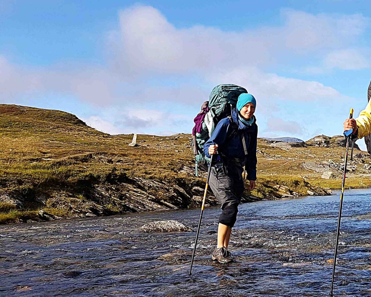 On januari 14, 2023 by trolletEfter en vecka i fält gick det tungt nu. Jag tror de flesta av vännerna var trötta den här dagen och det var bara ett par vänner som pratade med varandra. Resten av oss gick omkring som zombies. Det blev också lite luckor emellan oss och jag kunde gå lite mera för mig själv under förmiddagen vilket var välkommet för min del. Det blev lugnt och skönt och jag kunde vara ifred med mina egna tankar. Jag sov dåligt nu när kroppen gjorde mera ont och fötterna kändes inte som sig själva längre. Precis när jag kände att mina skor började torka upp blev det vadning igen. Mina fötter var konstant genomblöta. Vätan kom från flera håll när regnet föll till och från under dagen. När vi gick över kalfjället mötte vi en kall vind som svepte fram. Vi tog en paus på toppen medan vår guide stannade och pratade med en stugvärd. Jag frös så jag nästan skakade och det blev en plågsam paus när mina fuktiga fötter snabbt förvandlades till isklumpar i den kalla vinden. Jag satt insjunken i mig själv utan att prata med någon och bara väntade på att få gå vidare och trampa liv i mina fötter igen. Vi satt inte särskilt länge men just där och då gick tiden otroligt långsamt. Jag var alldeles för kall för att kunna njuta av utsikten. Det gör verkligen mycket för upplevelsen att hålla sig varm och torr.