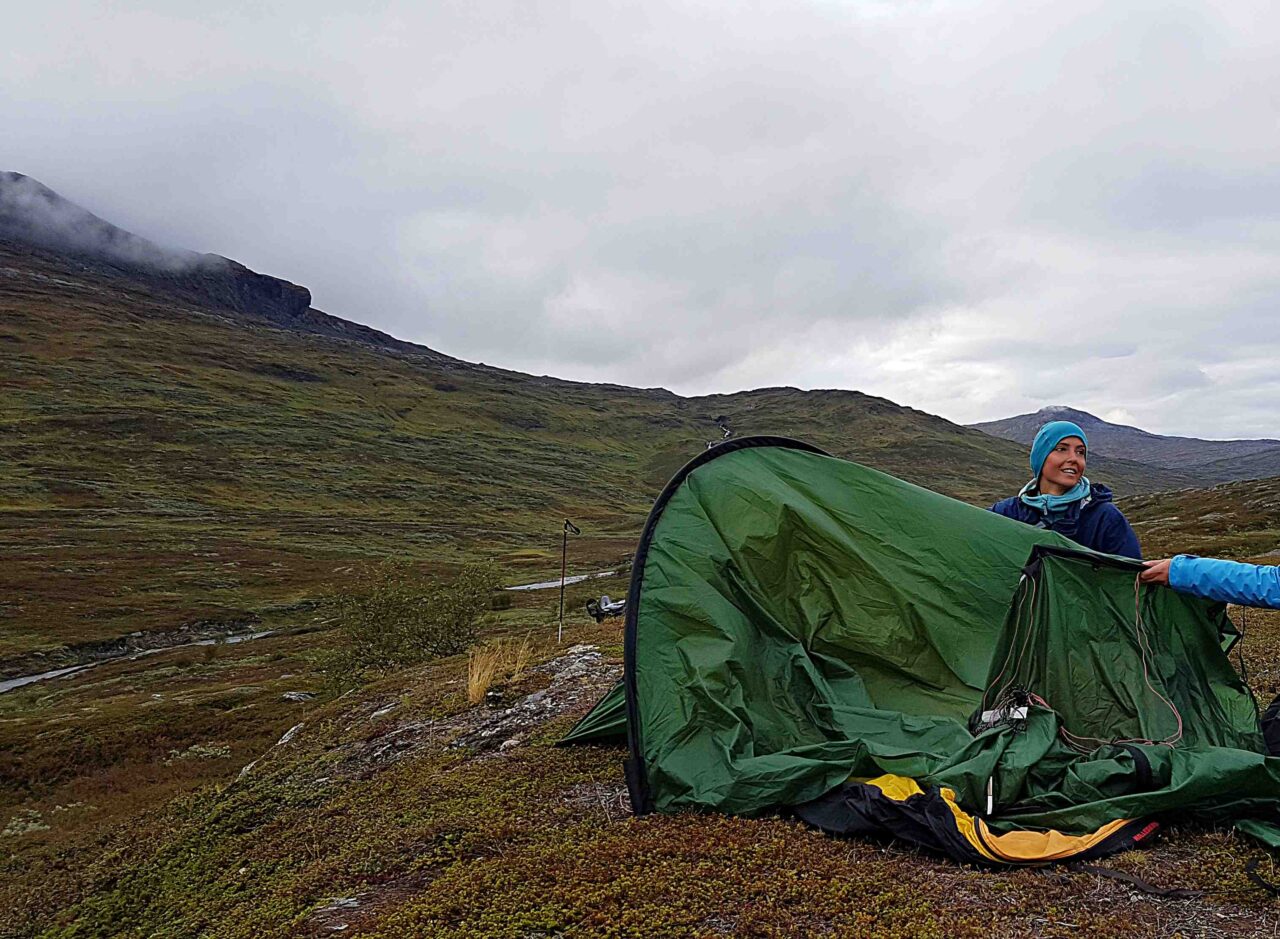 Vi närmade oss Tarradalen och jag längtade efter träd och buskar. Men vi skulle spendera en natt till på fjället först och trötta hittade vi en tältplats för natten. Jag och min tältkamrat hade haft problem med vårat tält, och det verkade som att delarna inte riktigt passade ihop, och det blev alltid snett och krokigt när vi satte upp det. Den här kvällen ansträngde vi oss extra mycket för att få tältet rakt. Vi drog i det hit och dit och försökte justera ett par extra gånger och jublade när det plötsligt stod upp som ett tält ska göra. Men lyckan var kortlivad när vi drog upp blixtlåset och fick se ett innertält i uppror! Vi skrattade uppgivet åt hopplösheten och kröp in i vårt krokiga tält för att få vila och sova. Vi småpratade en stund som vi gjort varje kväll innan vi skulle sova och lyssnade på regnet mot tältduken. Bland annat pratade vi om att vi upplevde tältet obehagligt. Det kändes ibland som att vi inte var ensamma i tältet och det var alltid något som krånglade med det. Medan vi låg där på rygg och pratade och tittade på tältduken såg vi vattendroppar formas på insidan. Skeptiskt granskade vi dem och trodde att det måste vara kondens från våra fuktiga kläder. Ventilationen var helt öppen men luften utanför var ju så fuktig som den bara kunde bli. Men vi såg mer och mer droppar ta form innanför duken och när några droppar plötsligt började rinna längs duken kastade vi oss mot mitten i det lilla tältet och krafsade desperat ihop våra sovsäckar. Inte det också! Det räckte med att skor, kläder, tält och allt annat var blött, men sovsäckarna fick inte bli blöta! Vi kunde bittert konstatera att vårt tält börjat läcka in. Tätt, tätt ihoptryckta i en boll med sovsäckarna sov vi oroligt och vaknade gång på gång och drog i sovsäckarna för att försäkra oss om att de inte vidrörde tältduken och vattnet som rann efter den. Nu kändes det inte kul längre när vi inte ens kunde slappna av inne i tältet och få välbehövlig vila. Kanske en vecka var gränsen för oss när vi var ute på tur. Men vi hade inte långt kvar!