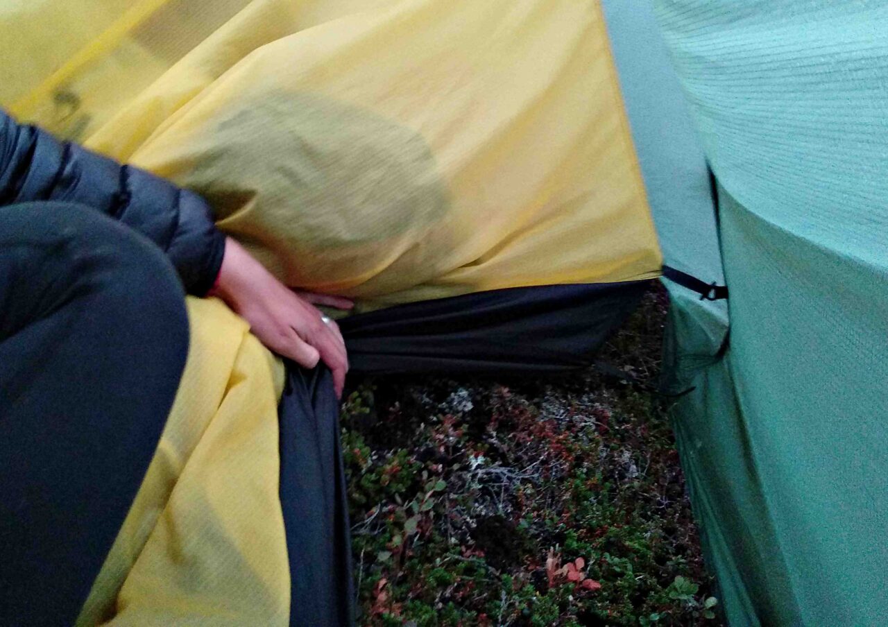 Vi reste vårt hemska tält igen och förberedde med liggunderlag och sovsäckar, men när min tältkamrat la sig ner såg jag henne reagera på något. En sten stack upp under hennes liggunderlag. Den var under tältet så vi samlade ihop allt i innertältet och hakade av det en bit för att slippa gå ut i regnet, och tänkte att vi bara skulle peta bort stenen och kasta ut den under tältduken. Den kunde ju inte vara så stor när vi inte lagt märke till den när vi slog upp tältet. Men så som det gärna kan vara med stenar så visar de bara en liten del ovan markytan. Sittandes med sovsäckar och innertält i famnen tog vi i det vi kunde med fingrarna men vi kunde inte rubba stenen, och skrattandes turades vi om att försöka få bort den. Plötsligt fick jag en lysande idé! Jag drog fram min spork som hjälpmedel för att försöka bända upp stenen med, men sporken var dessvärre gjord av trä… och gick av! Med tröttfnitter som övergick till hysteriskt skratt turades vi om att karva med min avbrutna spork tills vi övervann stenen och äntligen kunde knuffa ut den under tältduken. Vi fortsatte skratta så att tårarna rann efter vi lagt oss och konstaterade att ingenting är omöjligt i det hemsökta tältet.